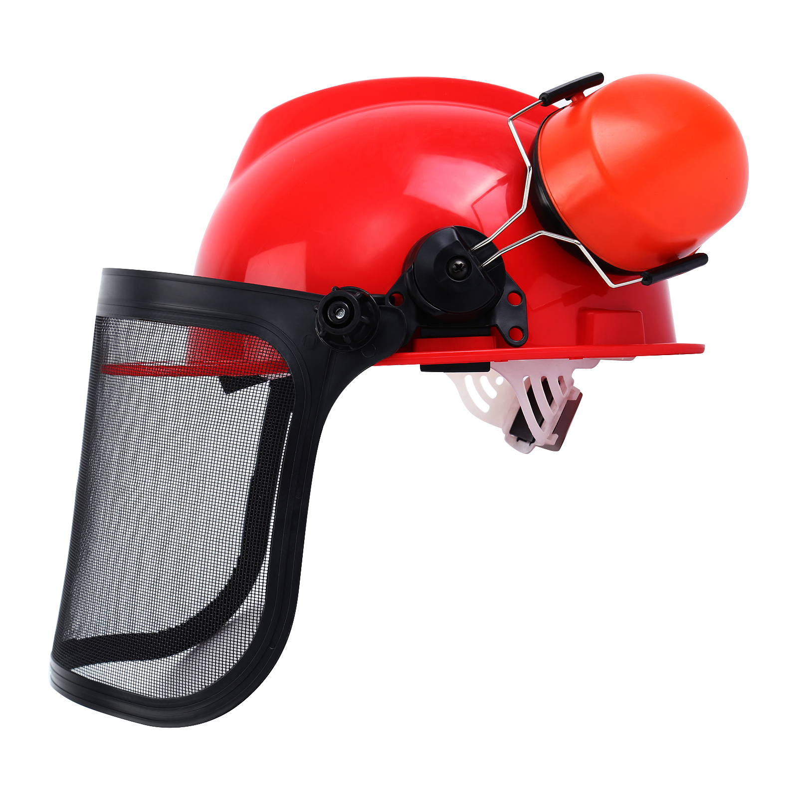 Color: casco rojo + orejeras naranjas + protección facial negra