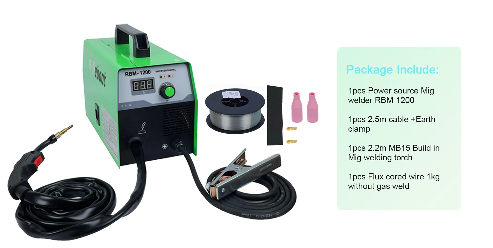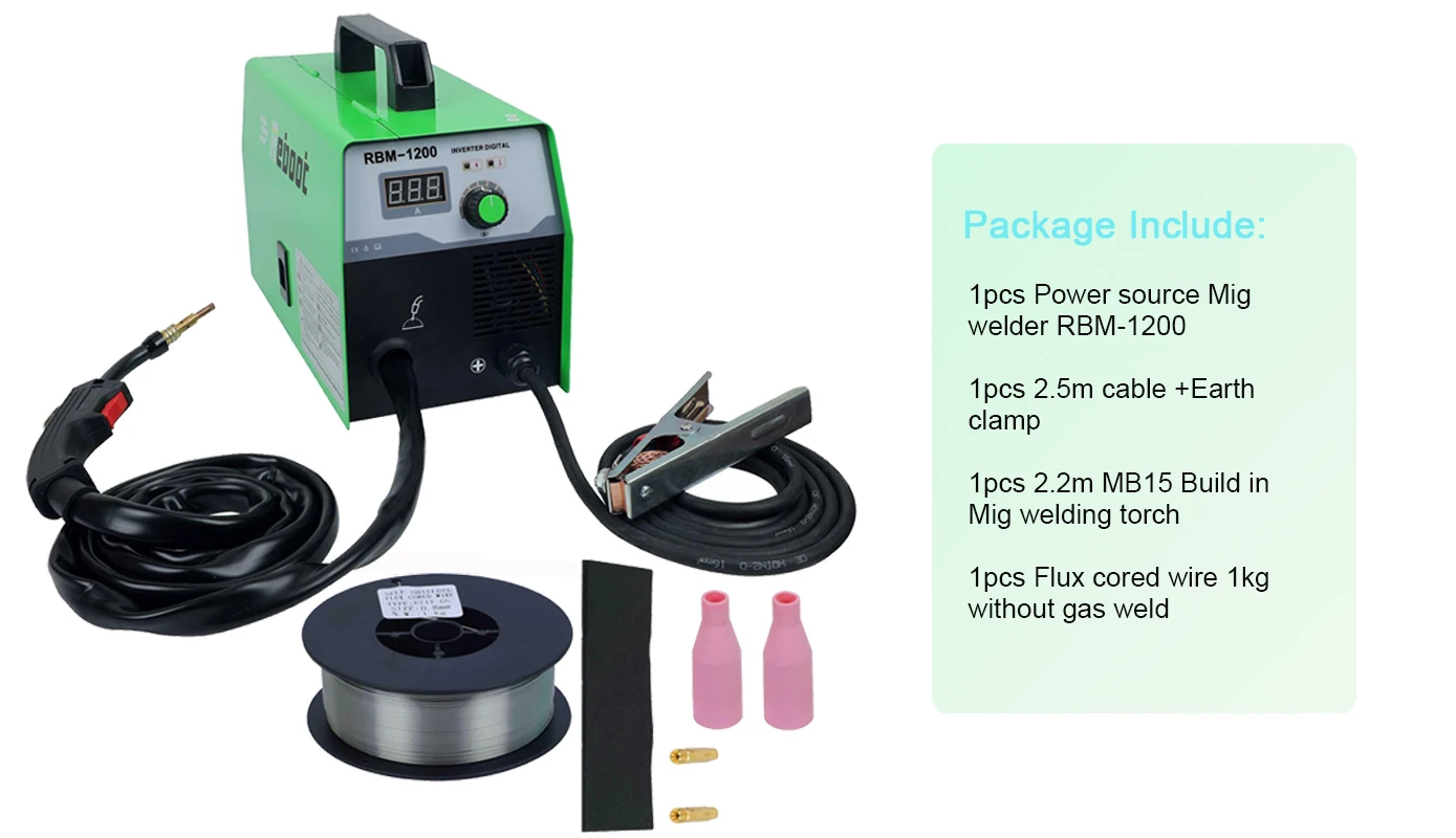 2. Soldador inversor MIG 120A máquina de soldadura portátil, fácil de usar por principiantes. 3. Utiliza el cable del núcleo de fundente para soldar hierro sin gas. 4. Vaya con el cable del núcleo de fundente de 1 kg 0,8mm más perfectamente. | |||||||||