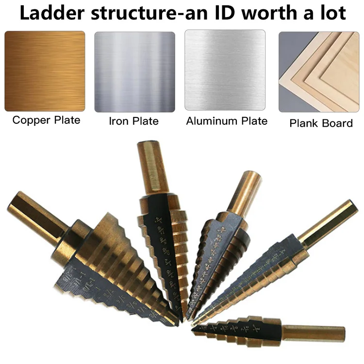 ⚡️Este juego de brocas escalonadas incluye 5 brocas con punta de acero de alta velocidad que son ideales para perforar agujeros en materiales más blandos como plástico, madera y chapa.