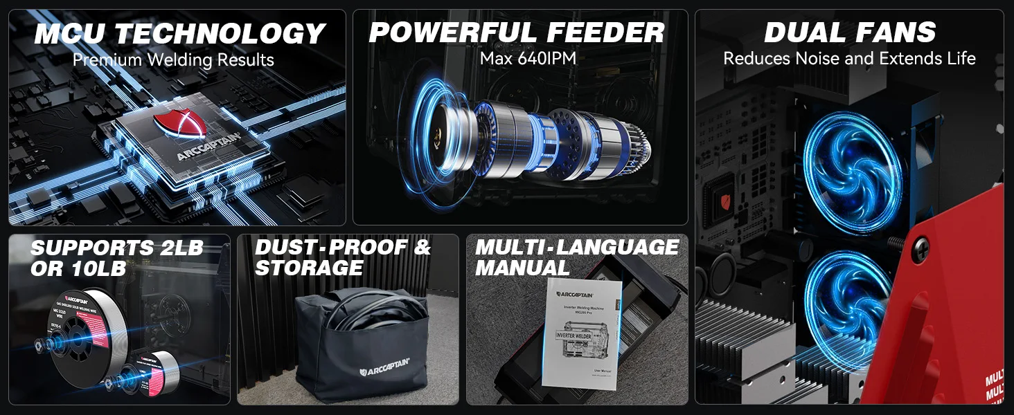3. ACTUALIZACIÓN DE TECNOLOGÍA:Diseño con máquina de alimentación de alambre de 40 W, velocidad máxima de alimentación de alambre de hasta 640 ipm.El diseño del soldador de 230 V con 2 ventiladores hace que el enfriamiento de los soldadores sea más eficiente.