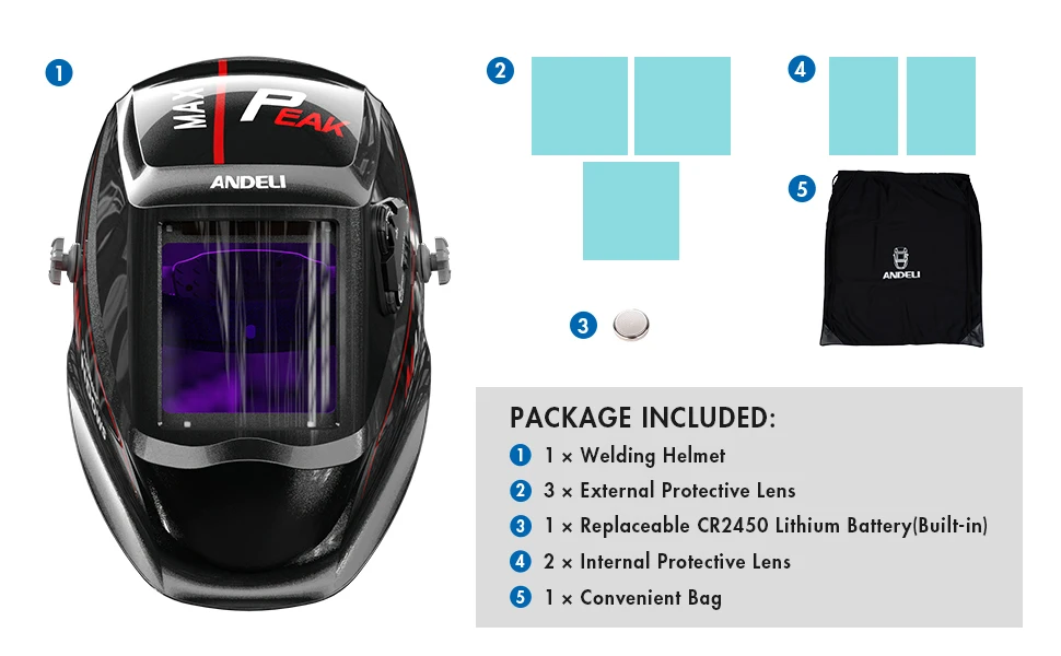 ⚡️La máscara de soldadura EAK-990T de ANDELI está diseñada para ser utilizada en soldadura por puntos y continua, MIG y TIG. La EAK-990T cuenta con un campo de visión ultra amplio con lentes ópticamente correctas de doble vista y lentes de policarbonato de 3/8″ de espesor.