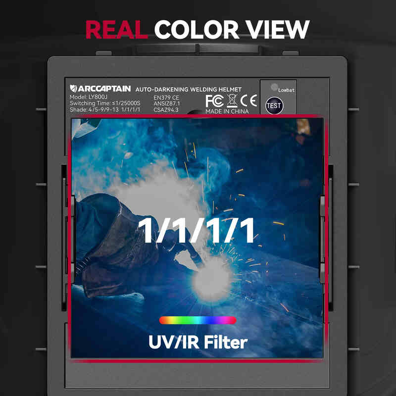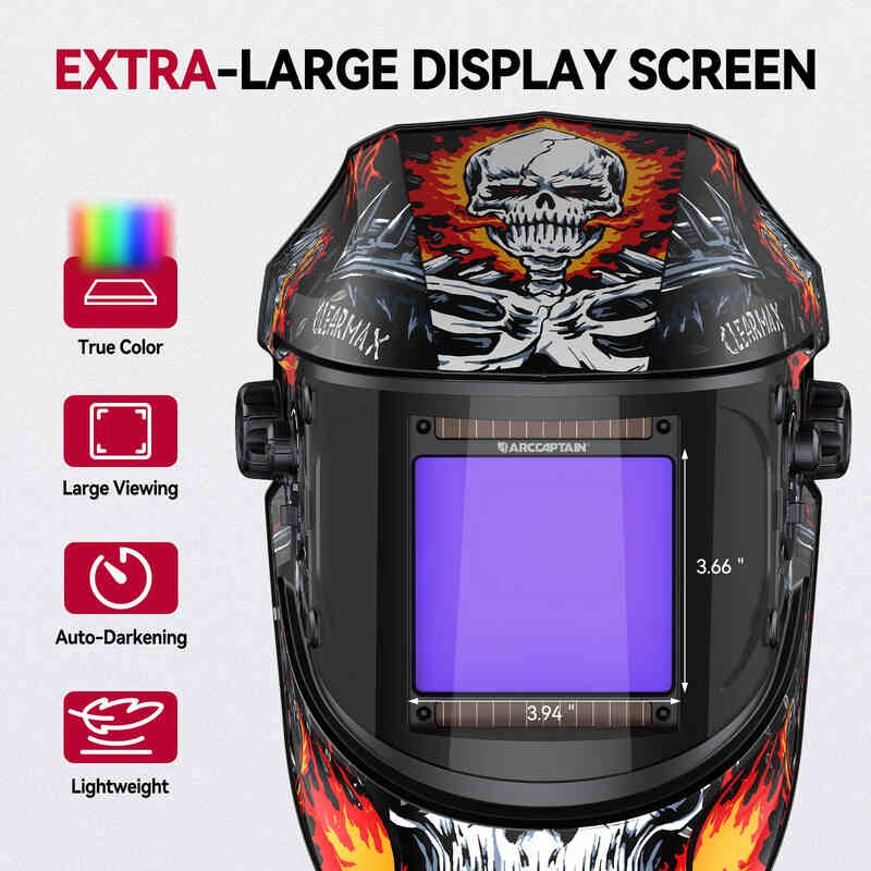 La máscara de soldadura ARCCAPTAIN está diseñada para ofrecer seguridad y confort de alto nivel. Con su pantalla grande 1/1/1/1, proporciona claridad óptica superior, lo que permite ver con detalle cada soldadura sin esfuerzo. Además, su tecnología de oscurecimiento automático reacciona en milisegundos para proteger tu vista de los destellos intensos, asegurando una transición fluida entre la luz y la sombra.