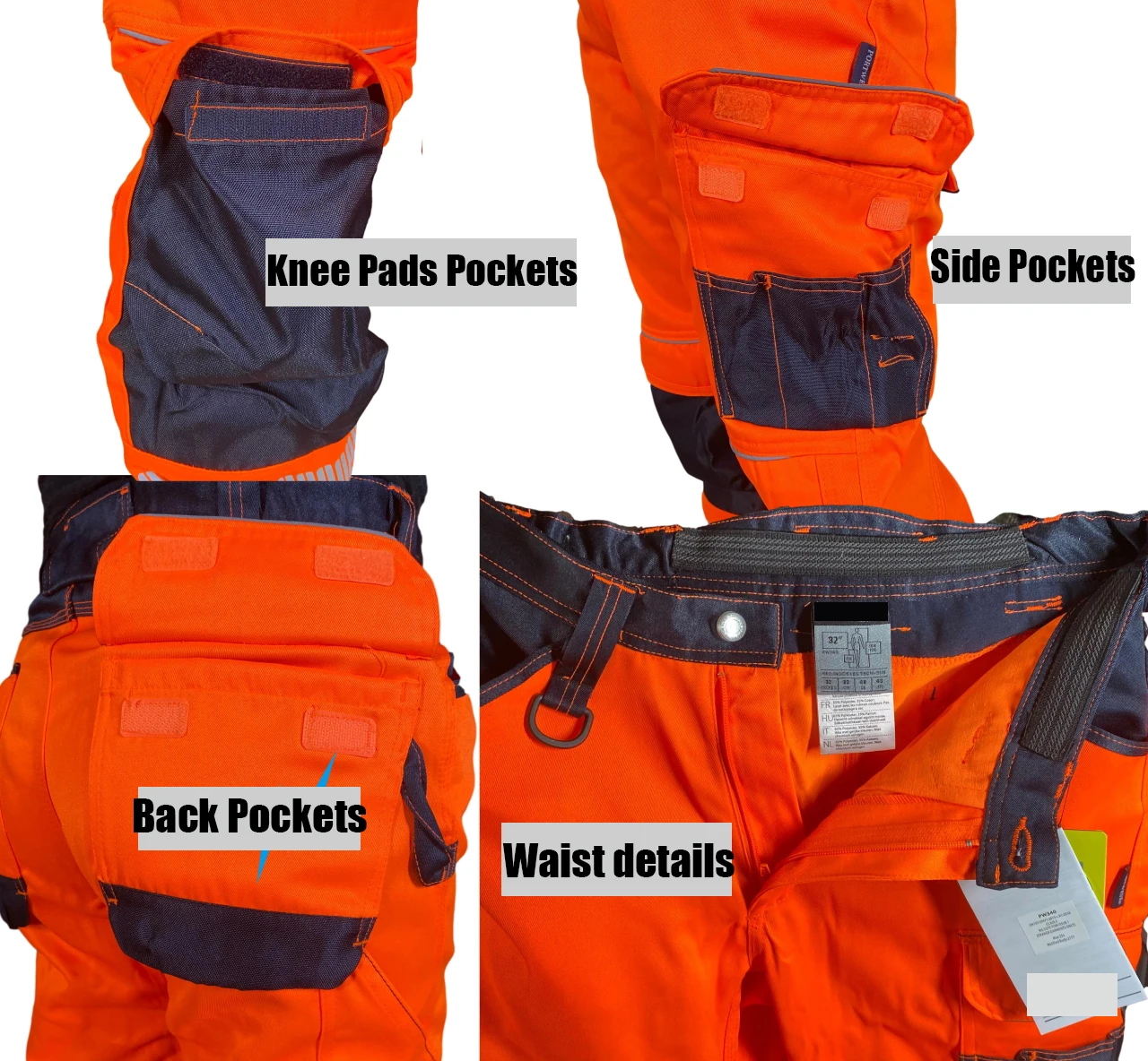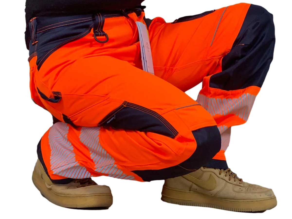 Estos pantalones ofrecen protección contra posibles abrasiones, golpes y caídas, mientras que las cintas reflectantes mejoran la visibilidad, especialmente en áreas de construcción de alto tráfico.