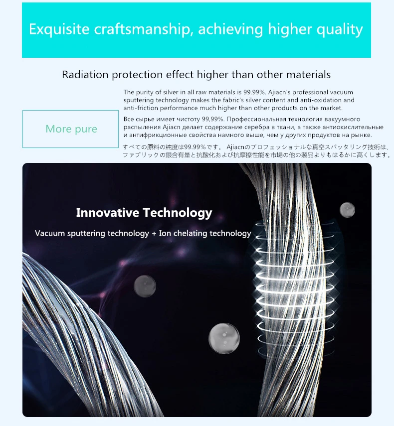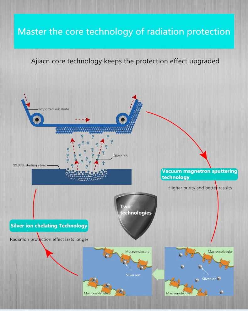La cubierta de cabeza de protección contra radiación de fibra plateada es un producto de alta tecnología que se obtiene al unir la plata permanentemente a una superficie de fibra a través de una técnica especial. Esta estructura no solo hace que la fibra plateada mantenga la propiedad textil original, sino que también le da toda la función mágica de La Plata, el efecto mágico de la fibra plateada. La plata tiene las propiedades antibacterianas más eficaces. La tela de fibra de plata a prueba de radiación hecha de fibra que contiene plata que utiliza nanotecnología es la última tecnología a prueba de radiación en el mundo después de la tela de fibra de metal anti-radiación. Tiene las funciones de protección contra la radiación, antibacteriano y antiincrustante, es la producción de tela ideal de cubierta de cabeza a prueba de radiación. Su efecto antiradiación es superior a la tela a prueba de radiación hecha de otros materiales metálicos, que se puede usar cerca del cuerpo y es beneficiosa para el cuerpo humano.