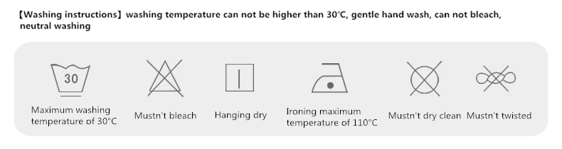 3.No se puede frotar ni lavar a máquina. No se puede decolorar, después del lavado, no se puede escurrir, recoger directamente del agua y colgarlo en una habitación ventilada y seca, evitar la exposición;