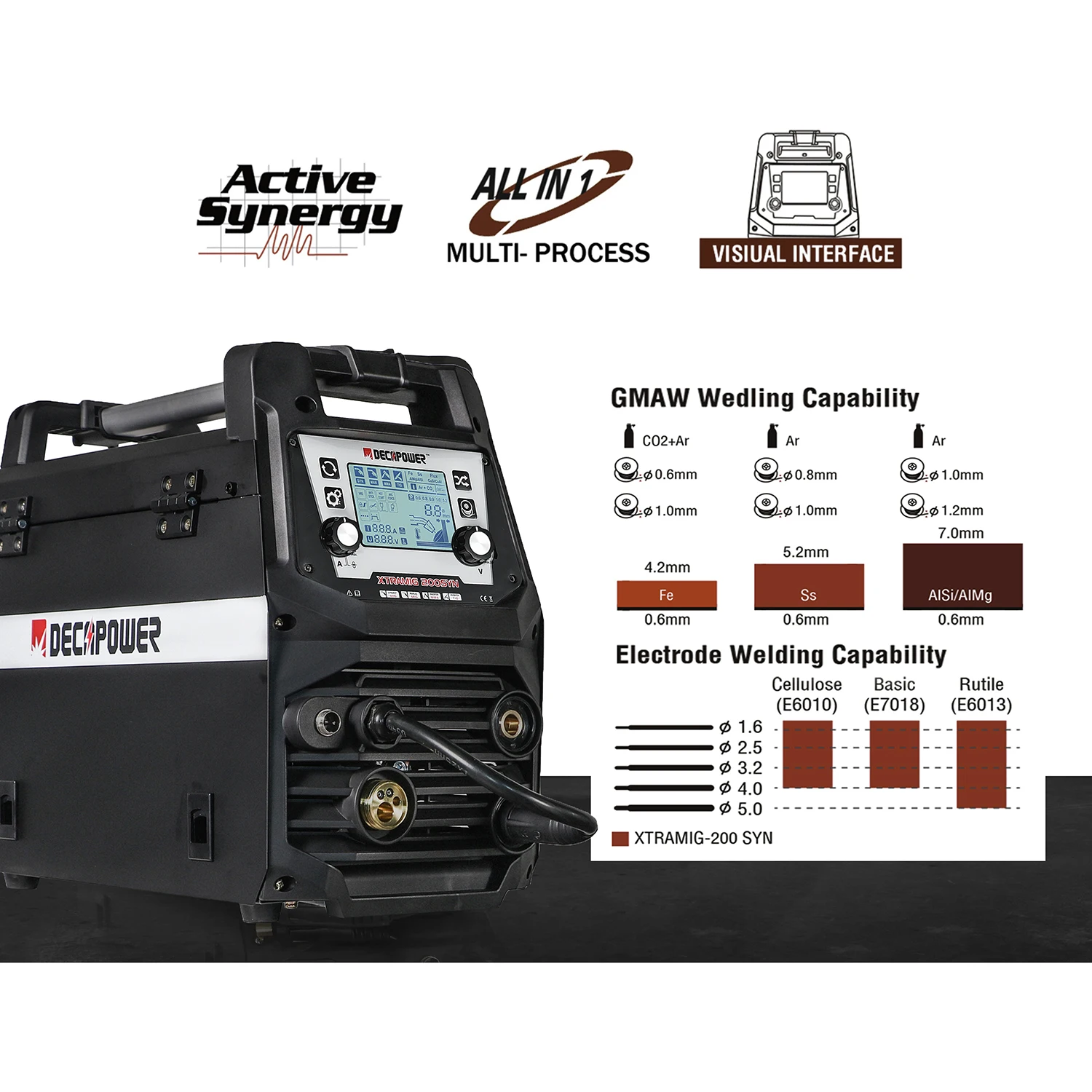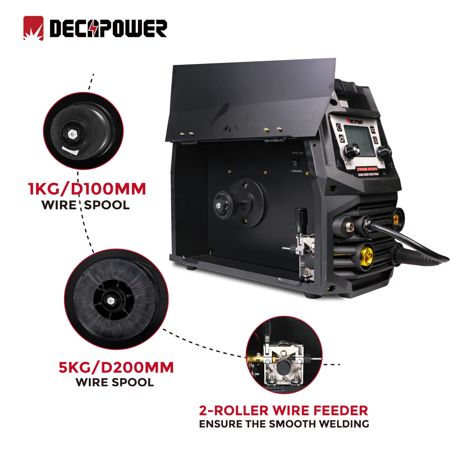 The latest DECAPOWER multi-function Synergy series microprocessor controlled inverter welding machine can satisfy your demands totally ! ALL IN ONE: GAS MIG/MAG welding, NO-GAS Flux cored wire welding, Braze MIG welding, Aluminium Wire welding, Copper Wire Welding, Stainless Steel wire welding, SPOTWelding, 2T/4T Welding, ARC Stick welding, DC lift TIG welding.